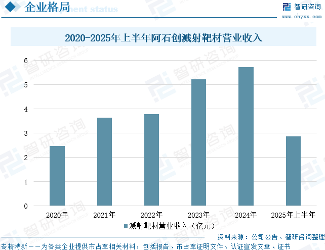 福建阿石创新材料股份有限公司专业从事PVD镀膜材料的研发、生产与销售,自主研发200多款高端镀膜材料,覆盖新型显示、光学光通讯、太阳能光伏、半导体等多个领域,主要产品包括ITO、钼、铜、铝、硅、钛、钽及各类合金与稀有金属靶材,下游客户涵盖京东方、华星光电、水晶光电、舜宇光学、群创光电等一线龙头企业。阿石创作为国内PVD镀膜材料行业设备最全、技术最先进、产品最多元化的龙头企业之一,拥有国家级“高效太阳能电池装备与技术国家工程研究中心(联合单位)”“福建省镀膜靶材企业工程技术研究中心”“福建省院士工作站”等专业多个科研平台,分别与闽都创新实验室、广东新材料研究院周克崧院士团队、中科院沈阳金属所、台湾清华大学、福建理工大学等科研院所建立了稳定的技术研发和项目合作关系。数据显示,2025年上半年,阿石创溅射靶材营业收入为2.87亿元,同比增长4.36%。