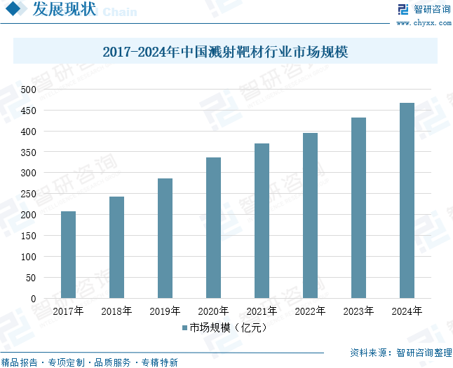 溅射靶材是指通过磁控溅射等镀膜系统在适当工艺条件下溅射沉积在基板上形成各种功能薄膜的溅射源。溅射靶材广泛应用于半导体集成电路、平面显示、太阳能电池、信息存储、低辐射玻璃等领域,是国家重点支持和鼓励发展的行业。近年来,随着国内平面显示、半导体集成电路及太阳能电池等产业的快速发展,相关下游产业链持续向国内转移,有力推动了我国溅射靶材行业的整体进步。目前,国内溅射靶材需求已占全球总需求的30%以上,产业发展逐步从单一规模扩张转向以进口替代为主导的结构性升级。自2017年起,我国溅射靶材市场规模持续稳步扩大。2022年,行业规模达到395亿元,同比增长6.76%,但增速较2021年下降3.04个百分点,这主要受当年下半年全球半导体市场景气度回落向国内传导的影响。随着半导体市场逐步回暖,2023年中国溅射靶材市场规模已恢复至431亿元。进入2024年以来,全球半导体行业呈现结构性复苏态势,为溅射靶材市场注入新的增长动能,当年国内市场规模进一步提升至467亿元,同比增长8.35%。展望未来,在显示面板产能向国内持续转移、半导体产业链国产化进程稳步推进以及太阳能电池市场保持高景气度的多重驱动下,下游市场对高性能溅射靶材的需求有望持续稳定增长,我国溅射靶材行业正迎来更加广阔的发展前景。