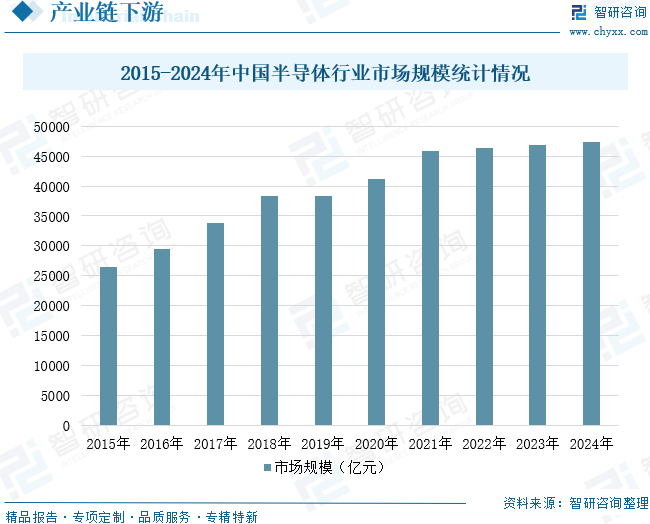 半导体行业是铜靶材的应用领域之一。在集成电路的制造中,铜靶材通过物理气相沉积技术用于制造金属层,特别是导电层和屏障层。铜互连技术是连接各个电子组件的关键技术,与传统的铝互连相比,铜具有更低的电阻和更高的电流承载能力,能够提高芯片的性能和可靠性。近年来,依托庞大的市场需求、持续的人口红利、稳定的经济增长以及积极的产业政策支持,中国半导体产业实现了快速发展。数据显示,2015年至2024年,中国半导体行业市场规模从26385.73亿元增长至47344.73亿元,年复合增长率达到6.71%。未来,随着半导体行业持续向先进制程演进、国产化进程不断加速,将进一步带动上游铜靶材在纯度提升、工艺适配及规模化供应等方面的需求增长,为铜靶材产业带来持续而明确的发展动力。