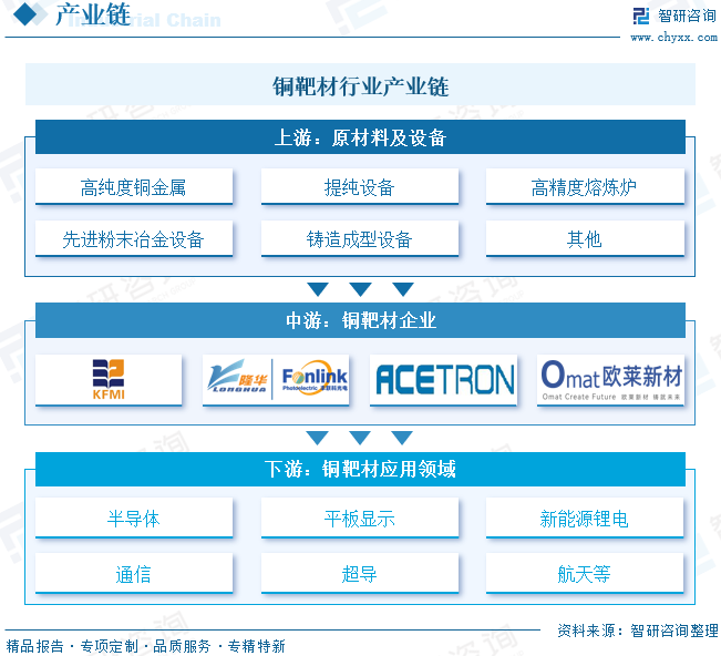 铜靶材产业链上游为原材料和设备,其中,原材料包括高纯度铜金属、提纯设备、高精度熔炼炉、先进粉末冶金设备、铸造成型设备等。产业链中游为铜靶材的生产制造环节。产业链下游为应用领域,主要应用于半导体、平板显示、新能源锂电、通信、超导、航天等领域。