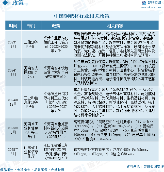 铜靶材凭借其优异的物理与化学性能,在半导体制造、光伏产业及显示技术等关键领域中发挥着不可替代的核心作用。近年来,国家及地方政府高度重视铜靶材行业的战略价值,已陆续出台一系列针对性政策,旨在推动技术创新、保障产业链安全,并促进产业向高端化、自主化方向发展。例如,2024年12月,工业和信息化部等四部门印发《标准提升引领原材料工业优化升级行动方案(2025—2027年)》,重点开展超高纯金属及合金靶材/蒸发料、形状记忆合金、高端聚烯烃、电子气体分离膜材料、电池膜材料、光学膜材料、光伏用膜材料、生物基新材料、特种涂料、特种胶黏剂、新型催化剂、高端试剂、稀土储氢材料、稀土磁性材料、稀土光功能材料、反光釉料、新能源复合金属材料、新能源电池材料等关键战略材料标准制修订。2025年3月,河南省工业和信息化厅等四部门印发《河南省重点新材料首批次应用示范指导目录(2025版)》,高纯度铜靶材(铜靶胚料)性能要求:(1)Cu≥4N(99.99%);(2)密度≥8.942/cm²;(3)晶粒尺寸≤50um;(4)硬度≤70HV;(5)总杂质含量<100ppm;(6)氧含量≤10ppm;(7)电导率≥101%;(8)平整度≤0.5mm/m。