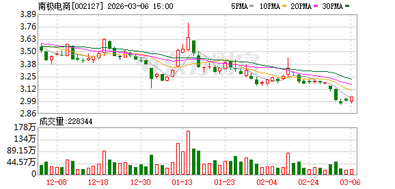 证券时报·数据宝统计显示,南极电商今日收盘价为3.03元,上涨1.34%,日换手率为1.14%,成交额为6874.48万元,全天主力资金净流入244.10万元,近5日该股累计下跌4.72%,近5日资金合计净流出3625.73万元。