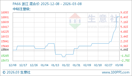 据生意社监测,PA6603月08日最新价格16833.33元/吨,最近5天上涨4.12%,10天上涨6.77%。