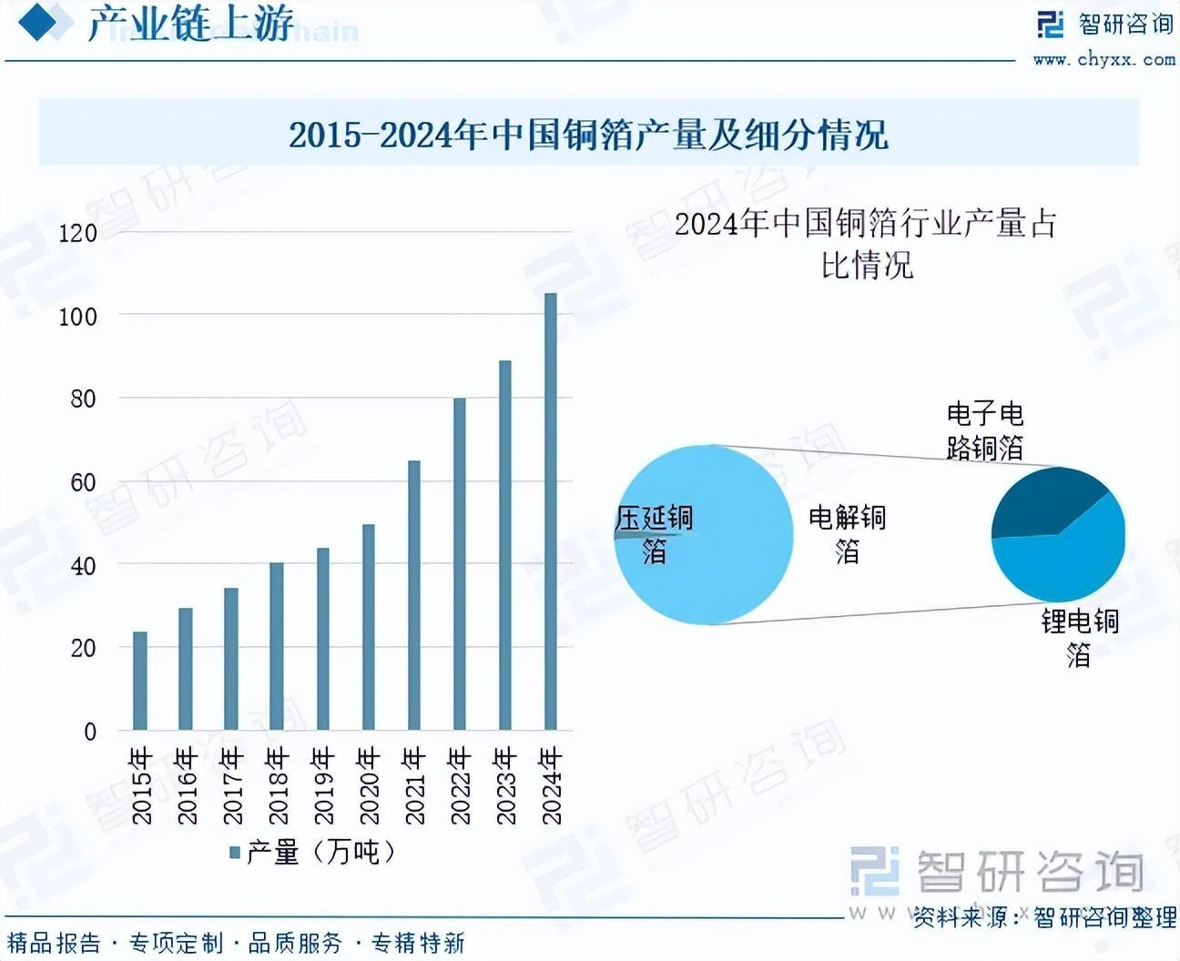 铜箔作为电子与新能源产业的关键基础材料,凭借其出色的导电性、导热性和延展性,在锂离子电池、电子电路、航空航天等多个领域发挥着不可替代的作用。中国铜箔行业经过多年的发展,已成为全球最大的铜箔生产国和消费国,产量位居世界前列。数据显示,中国铜箔产量从2015年的23.88万吨增长至2024年的105万吨,年复合增长率为17.89%。铜箔可分为电解铜箔和压延铜箔,其中,电解铜箔又细分为电子电路铜箔和锂电铜箔。2024年中国电解铜箔产量为103万吨,占铜箔产量的98.1%,其中电子电路铜箔产量为41万吨,锂电铜箔产量为62万吨;压延铜箔产量为2万吨,占铜箔产量的1.9%。未来,随着铜箔产量持续提升与技术进步,将为下游高频高速覆铜板行业提供更优质、更稳定的关键原材料保障。