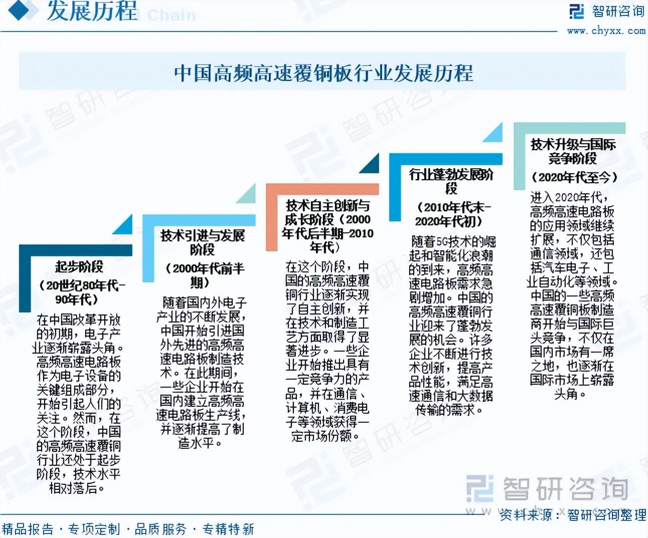 中国高频高速覆铜板行业发展历程大致可以分为起步阶段、技术引进与发展阶段、技术自主创新与成长阶段、行业蓬勃发展阶段和技术升级与国际竞争阶段,中国的高频高速覆铜板行业经历了从起步到成长的漫长历程,逐步实现了技术的突破和自主创新,随着技术的不断进步和市场的不断扩大,未来有望继续保持良好的发展势头。
