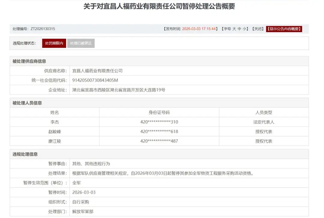 值得注意的是,此次处罚呈现出鲜明的“穿透式”特征。根据军队采购网公告,暂停期内,宜昌人福法定代表人李杰控股或管理的其他企业,将同步被暂停参加全军采购活动;公司授权代表廖江陵、赵峻峰也被暂停代理其他供应商参与相关采购。
