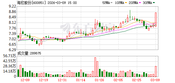 海欣股份(600851)今日涨停,全天换手率3.93%,成交额2.46亿元,振幅12.42%。龙虎榜数据显示,沪股通净卖出436.76万元,营业部席位合计净买入4288.77万元。