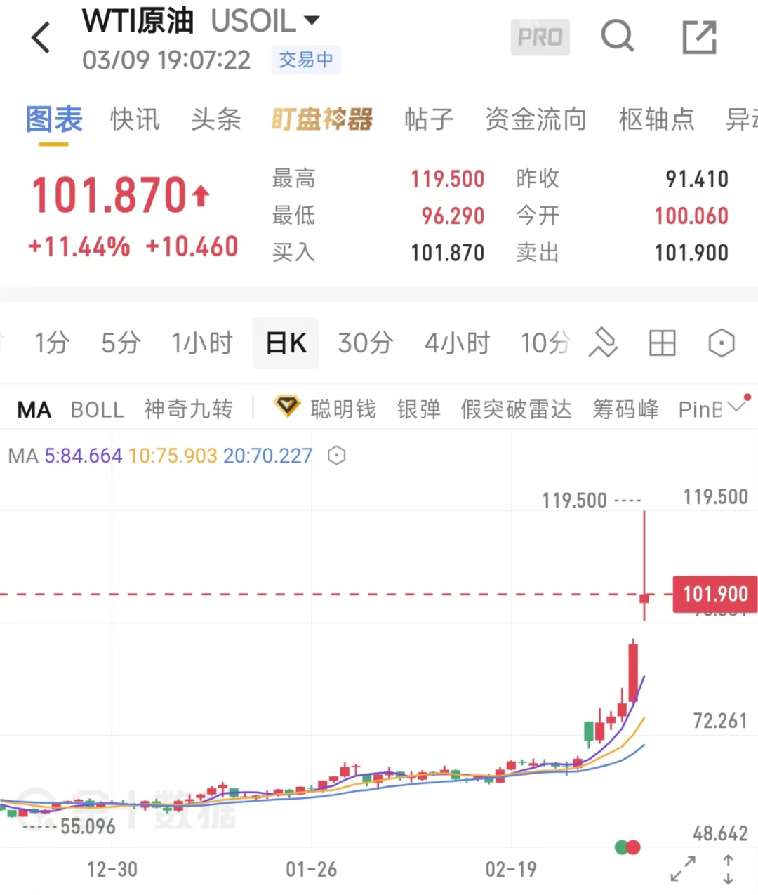 本周一(3月9日)亚太交易时段,WTI原油期货盘中一度上涨30%,报118.88美元/桶;布伦特原油期货涨超27%,报118.73美元/桶。