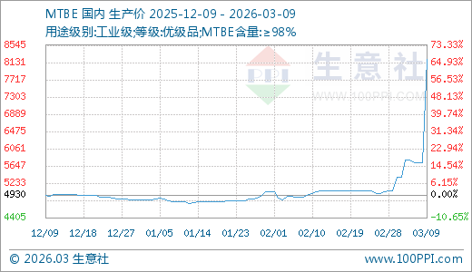 据生意社监测,MTBE03月09日最新价格8200.00元/吨,最近5天上涨41.79%,10天上涨62.91%,30天上涨67.23%,60天上涨71.55%。