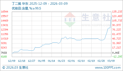 据生意社监测,丁二烯03月09日最新价格15680.00元/吨,最近5天上涨42.98%,10天上涨56.80%,60天上涨72.62%。