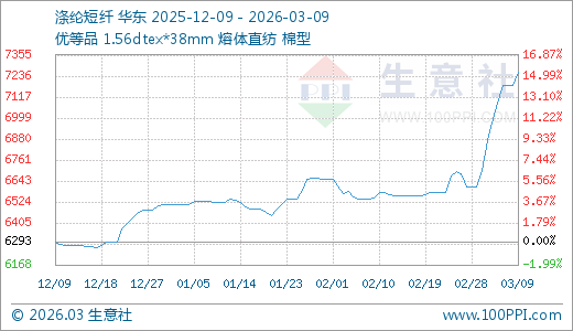 据生意社监测,涤纶短纤03月09日最新价格7256.28元/吨,最近5天上涨4.07%,10天上涨9.75%,20天上涨10.65%。