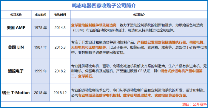 2014年,公司通过收购AMP,掌握了步进电机技术;2015年拿下Lin的0.9°混合式步进电机前沿技术,打入高端市场;2018年又收购运控电子,完善了大批量制造体系。