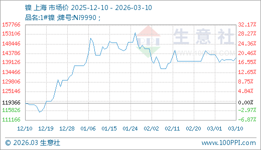 据生意社监测,镍03月10日最新价格141633.33元/吨,最近30天上涨3.95%,90天上涨18.65%。
