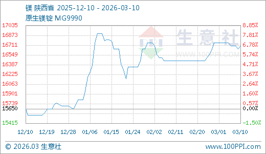 据生意社监测,镁03月10日最新价格16700.00元/吨,最近90天上涨6.71%。