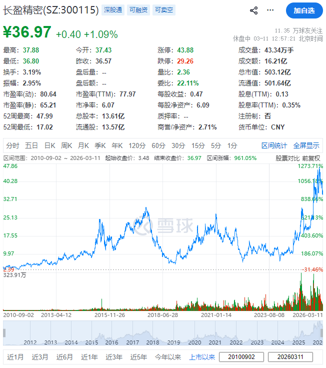 长盈精密(300115.SZ)于2010年9月2日在A股上市,截至3月11日午间收市,其总市值约503.12亿元人民币。