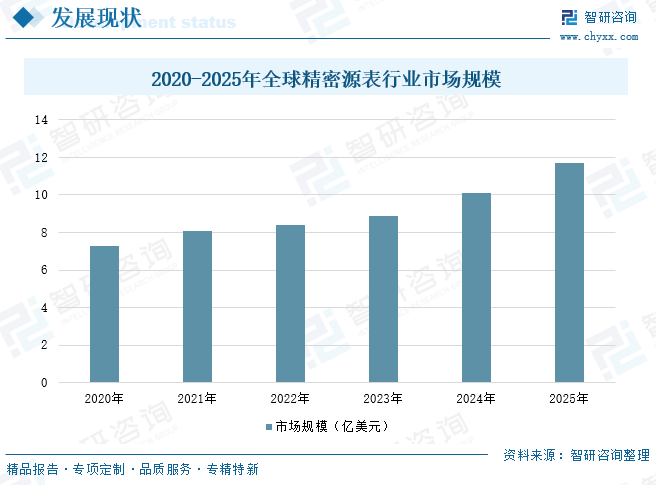 精密源表是电气及环境测试仪器中的重要的细分品类之一。近年来,在下游需求增加、技术迭代升级、应用场景拓展等多重利好因素叠加下,全球精密源表行业发展空间不断拓展,行业规模稳步扩张,由2020年的7.3亿美元增长至2025年的11.7亿美元,实现年复合增长率9.9%。