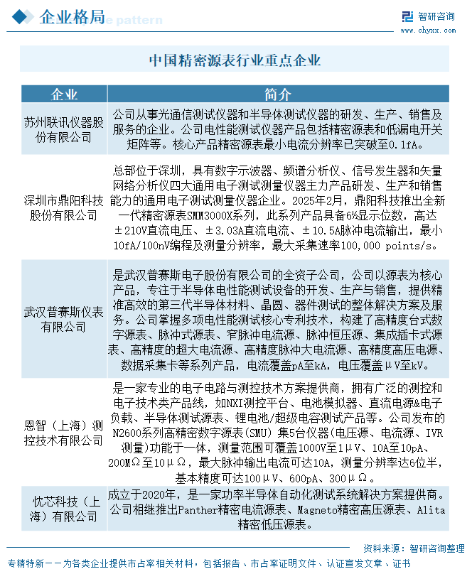 苏州联讯仪器股份有限公司、深圳市鼎阳科技股份有限公司、武汉普赛斯仪表有限公司、恩智(上海)测控技术有限公司、忱芯科技(上海)有限公司等本土企业纷纷推出了精密源表产品。2025年12月,忱芯科技(上海)有限公司完成亿元级战略融资,本轮融资由长江创新与金浦智能共同完成投资。随着越来越多的企业开始布局精密源表赛道,行业国产化水平将不断提升,同时资本市场的加持也将推动国内精密源表行业发展提速。