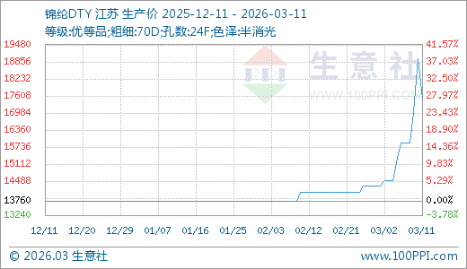 据生意社监测,锦纶DTY03月11日最新价格17500.00元/吨,最近5天上涨10.20%,10天上涨22.38%,20天上涨24.29%,30天上涨27.18%。
