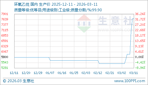 据生意社监测,环氧乙烷03月11日最新价格7683.33元/吨,最近5天上涨29.13%,10天上涨39.70%。
