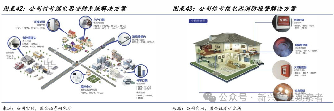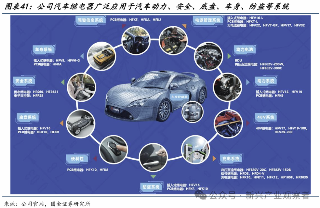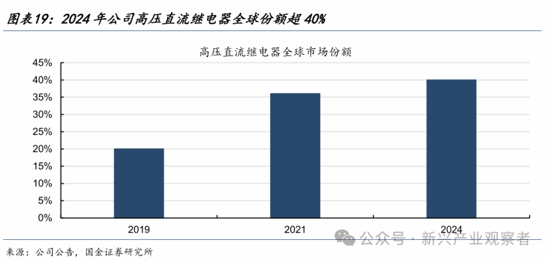 信号继电器主要用于通讯、安防监控、智能家居、轨道交通等领域,下游较为分散。1999年公司引入西门子第二代信号继电器产线;2003年推出HFD3第三代信号继电器实现国内高端突破,打破外资垄断;2022年2月公司研发的第五代信号继电器成功量产,在体积、功耗与驱动方式等核心指标上实现跨代领先,2024年以33.6%的全球份额蝉联行业第一。