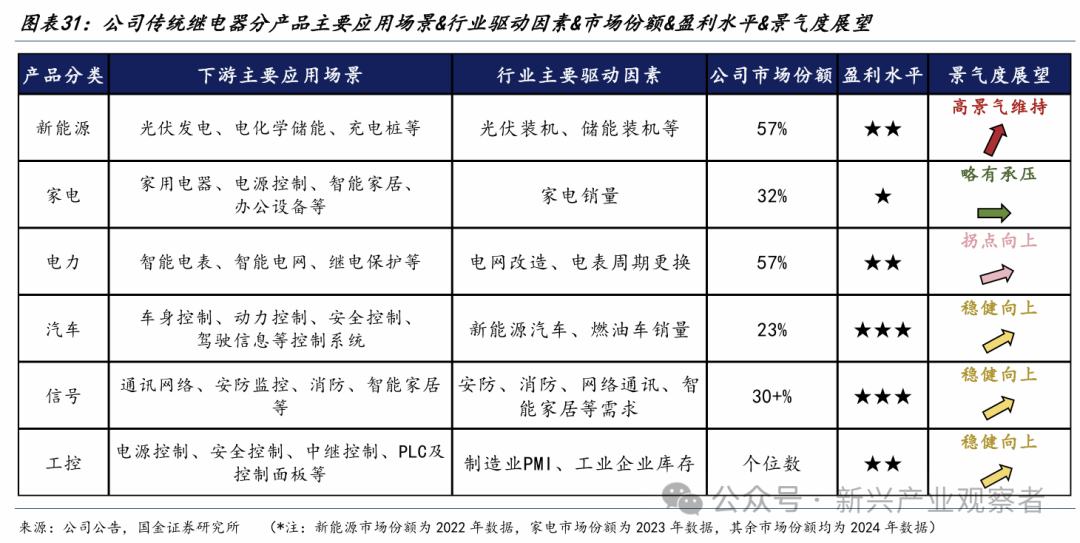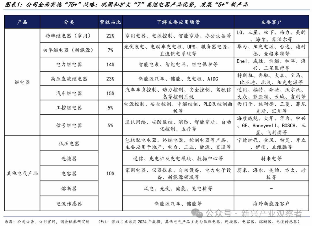 继电器业务:不断丰富产品矩阵,通过模块化的方式提升产品的稳定性、一致性,贡献稳定利润来源。2024年营收占比约90%,产品细分为功率继电器(①家用、②新能源)、③汽车继电器、④信号继电器、⑤工业继电器、⑥电力继电器、⑦高压直流继电器七大品类,广泛应用于家用电器、智能家居、智能电网、新能源、建筑配电、汽车工业、轨道交通、工业控制、安防、消防等领域,客户多为下游领域龙头公司。