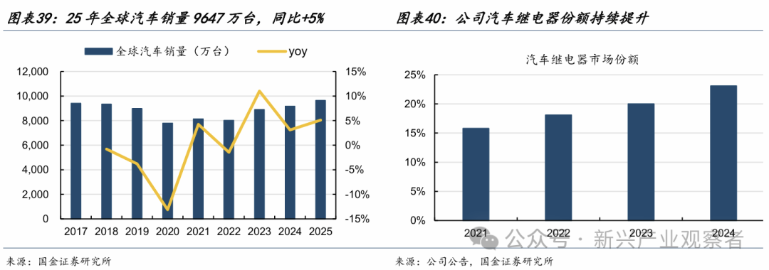 汽车继电器广泛应用于汽车动力、安全、底盘、车身、防盗等系统,是汽车上应用最多的电子元器件之一,其增长主要受:①下游汽车(燃油车&新能源汽车都需要配置传统低压继电器)销量、②汽车智能化、高端化提升单车价值量(功能复杂度提高导致继电器用量增加)双重因素驱动。2025年全球汽车销量达9647万台,同比+5%,不同车型单车用量20-70颗,对应每年全球需求超30亿颗(按照平均单车40颗计算),市场规模约120亿元(按照单价3元/颗测算)。