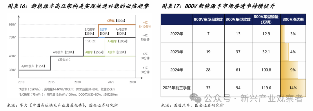 得益于800V平台对充电时间和整车动力性能的双重提升,将整车高压平台升级到800V成为新能源车型的重要发展方向。截至2025年前三季度,已有超30个汽车品牌完成800V车型的布局,市场渗透率达到13.7%,商业化进程明显提速。根据盖世汽车预测,到2030年,我国800V车型销量渗透率有望达到33.5%。