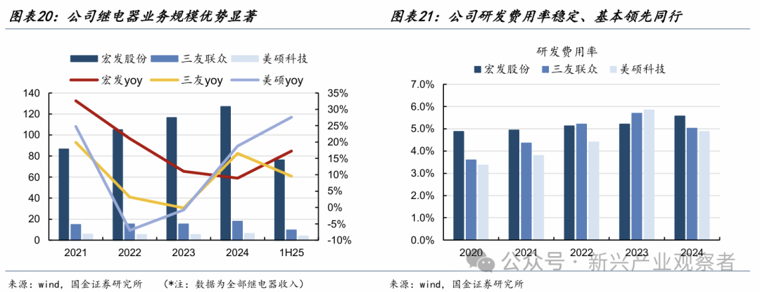 其他电气产品:2024年营收占比约10%,包括低压电器、连接器、电容器、熔断器、电流传感器五个新门类产品,加速实现从全球继电器领先企业到产品综合型公司的跨越。25H1公司完成新品研发项目462项,完成率90%,其中“5+”产品开发项目占比近45%。