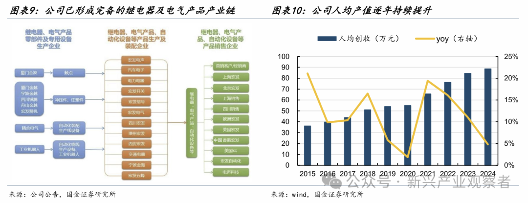 公司是全球继电器龙头,下游分布家电、汽车、新能源、电力等多个领域,通过国际化布局+垂直一体化&自动化生产+稳健经营风格构建长期竞争优势。24年公司全球市占率23%(公司公告,下同),稳居行业第一。过去10年公司营收/业绩CAGR 13%/14%,连年增长,近年公司加大力度推进“扩大门类”战略,打开成长天花板。