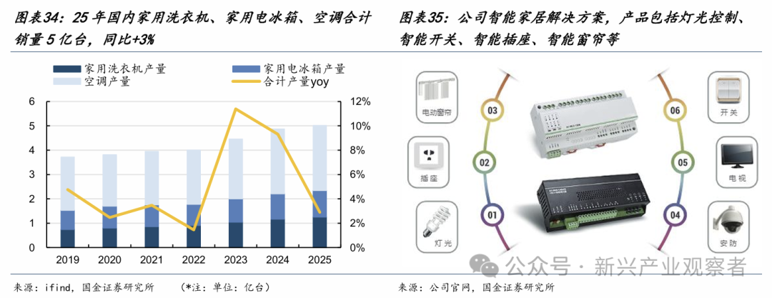 家用电器是功率继电器最主要的下游应用市场,单台家电大约需要4-8个继电器不等,随着家电朝着智能化、节能化方向发展,平均用量有望进一步增长。2025年国内家用洗衣机、家用电冰箱、空调合计销量5亿台,同比+3%。伴随智能家居、高端家电的发展,同时考虑到国内补贴退坡、行业竞争情况,我们预计2026年家电市场对功率继电器的需求有望保持中低速稳健增长。