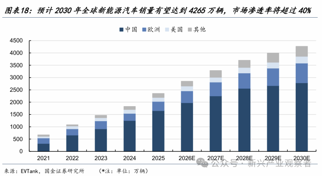 新能源汽车销量持续增长,到2030年全球销量有望提升至4265万辆,CAGR约13%。