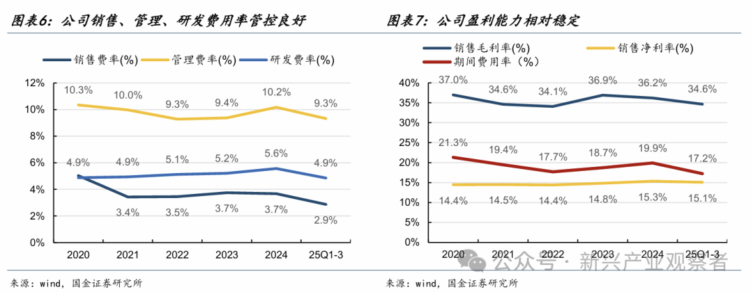公司高度重视研发投入,2020年以来公司持续加码人才储备,研发团队规模由2020年的1426人大幅跃升至2024年的2391人,通过持续的资金与人力注入加速产品矩阵完善及性能迭代。销售、管理费用率窄幅波动,盈利质量持续向好,净利率基本维持15%左右。