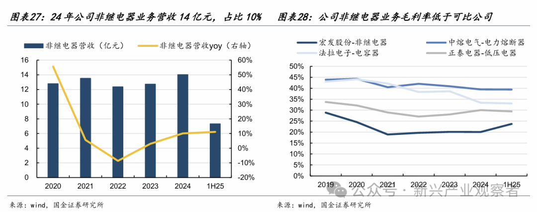 公司新产品重点围绕新能源、电动车等市场布局,定位中高端领域,同时以海外和头部客户为突破口。2024年公司非继电器业务营收14亿元,占比10%,毛利率低于各细分产品龙头,主要由于公司非继电器业务中低毛利业务低压电器占比较高,同时整体非继电器业务营收体量较小。