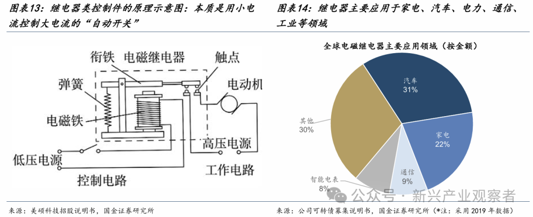 继电器是电气自动化控制与保护环节的重要部件,下游应用广泛。继电器本质是用小电流控制大电流的“自动开关”,在电路中起自动调节、安全保护、转换电路等作用:1)当输入量(如电压、电流)达到规定值时,使被控制的输出电路导通或断开的电器,保障电气系统运行安全和操作人员的人身安全;2)与接触器、开关、计时器等电路控制元件配合,通过设计开合逻辑、实现电气设备自动化控制。各类用电场景大多需用到继电器切换电路,因而继电器广泛应用于家电、汽车、电力、通信、工业等领域。