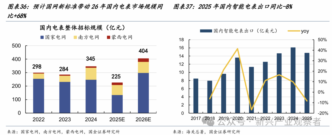 电力继电器广泛应用于智能电表、智能配网、继电保护等领域,其中智能电表是最主要的下游应用,主要由国内智能电表更换以及海外智能电网建设带来智能电表加速渗透驱动。25年受技术标准升级磨合期、价格博弈等因素影响,国网智能电表招标金额约135亿元,同比-46%,同时海外需求周期性波动,国内智能电表出口同比-8%。展望2026年,国网电表新标准招标有望迎量价齐升,全球智能电表短期波动不改长期铺设需求,南美、东南亚等新兴市场需求有望加速释放。