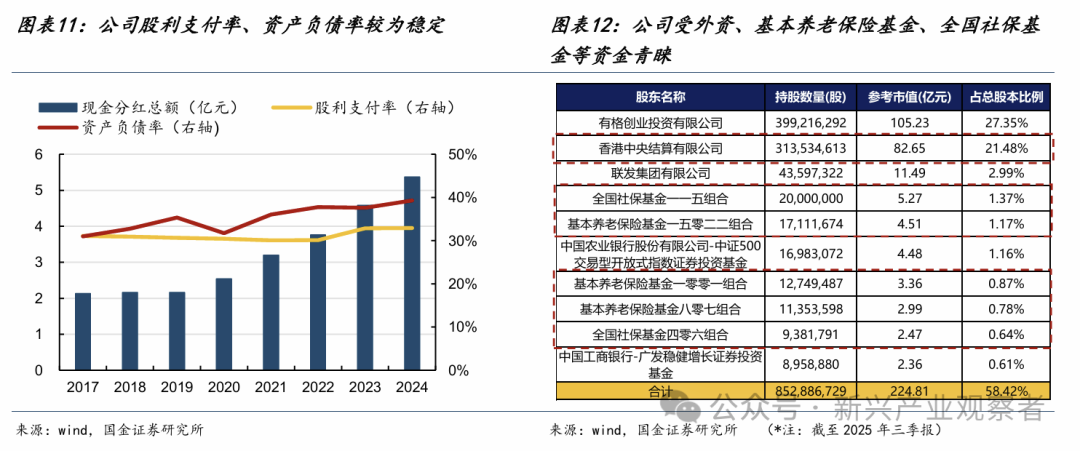 2017年以来公司股利支付率常年稳定在30%以上,资产负债率控制在40%以下,经营风格稳健,高级管理层长期在公司任职。此外自公司2012年上市以来业绩连续13年持续增长,吸引了众多长线资金的布局。截至2025年三季报,北向资金(香港中央结算)持股比例达21%,基本养老保险基金、全国社保基金均位列公司前十大股东名单。