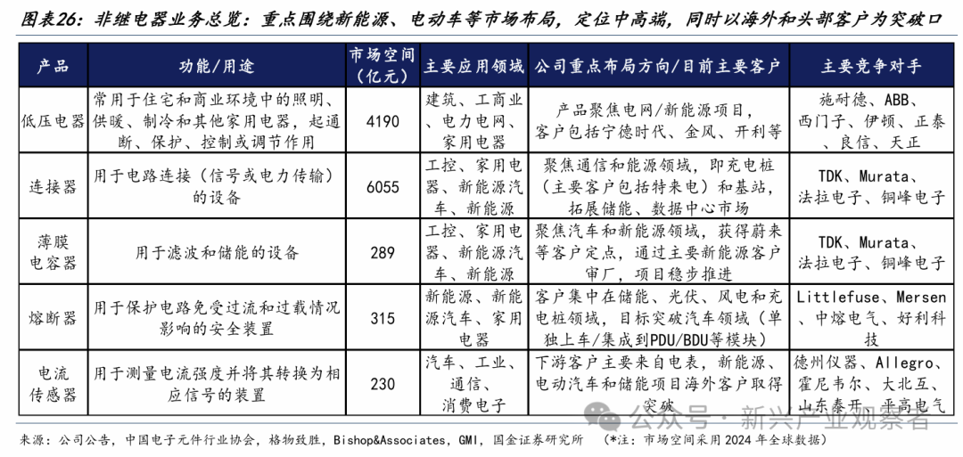 2)新门类产品:包含低压电器/连接器/电容器/熔断器/电流传感器等,合计TAM超1万亿元(根据中国电子元件行业协会等第三方数据)。公司重点围绕新能源、电动车等优势下游布局,定位中高端,同时以海外和头部客户为突破口。24年营收占比10%,看好公司从现有客户群拓展,通过产品打包销售&模块化优势导入,预计25-27年营收CAGR约35%,加速实现向综合元器件公司跨越。