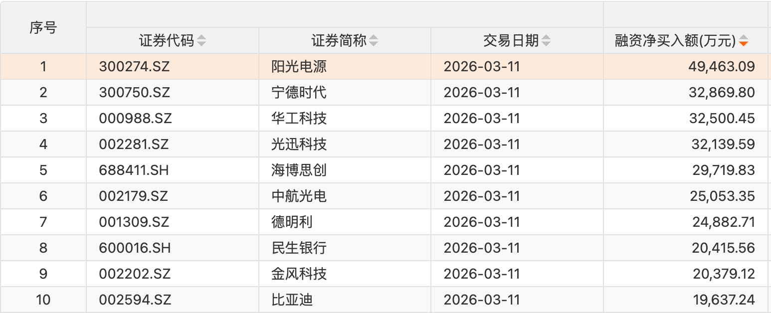个股方面,40只个股获融资净买入额超1亿元。阳光电源获融资净买入额居首,净买入4.95亿元;融资净买入额居前的还有宁德时代、华工科技、光迅科技、海博思创、中航光电、德明利、民生银行、金风科技、比亚迪。