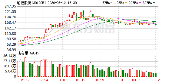 证券时报·数据宝统计,截至发稿,超捷股份收盘价为158.85元,下跌2.43%,本期筹码集中以来股价累计下跌9.64%。具体到各交易日,5次上涨,4次下跌。
