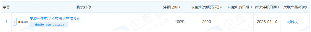 股权穿透显示,新公司由宁波一彬电子科技股份有限公司(简称“一彬科技”)100%持股。