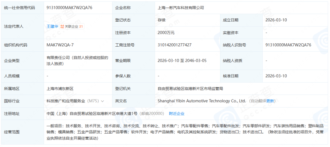 日前,企查查显示,上海一彬汽车科技有限公司成立,法定代表人为王建华,注册资本为2000万元,注册地址位于上海临港。