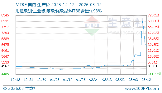 MTBE 03月12日最新价格6366.67元/吨,最近5天上涨11.05%,10天上涨18.27%,20天上涨26.24%,30天上涨27.67%,60天上涨33.10%。