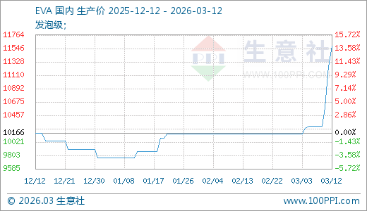 EVA 03月12日最新价格11583.33元/吨,最近5天上涨12.64%,10天上涨14.12%,60天上涨18.60%。