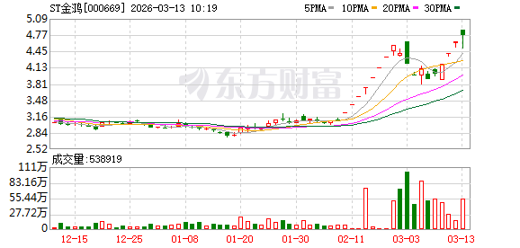 ST金鸿盘中涨停,已连收4个涨停板,截至9:27,该股报4.86元,换手率0.43%,成交量292.53万股,成交金额1421.70万元,涨停板封单金额为3792.99万元。连续涨停期间,该股累计上涨21.50%,累计换手率为13.81%。最新A股总市值达33.07亿元。