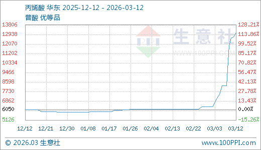据生意社监测,丙烯酸03月12日最新价格13083.33元/吨,最近5天上涨58.59%,10天上涨106.04%,20天上涨113.90%,60天上涨123.01%。