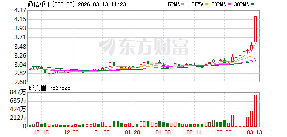 数据宝统计,截至10:50,通裕重工成交额29.44亿元,创2021年8月6日以来新高。最新股价上涨19.94%,换手率20.00%。上一交易日该股全天成交额为13.48亿元。(数据宝)