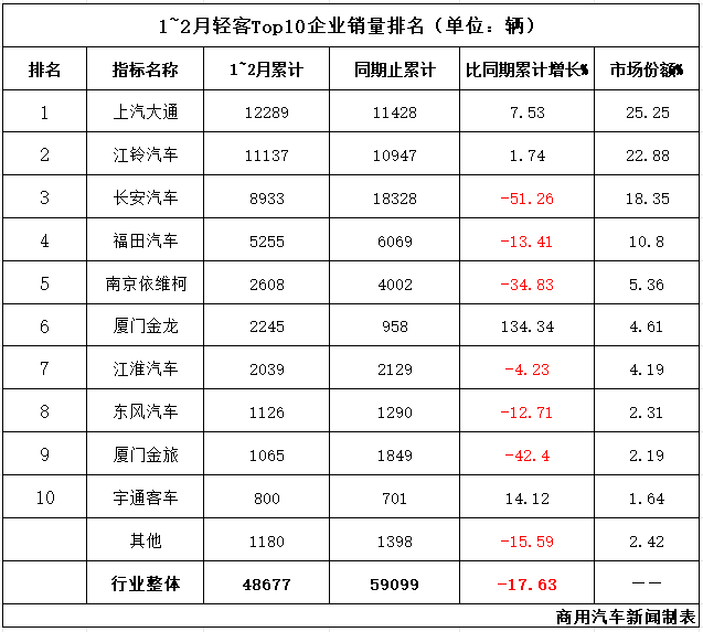 与上月相比,轻客市场1~2月累销排名变化不大,仅有厦门金龙和江淮汽车互换了位置,厦门金龙凭借2月的良好销量表现上升一个位次,排名第六;江淮汽车排名下滑至第七。其他企业及其排名未发生变化。