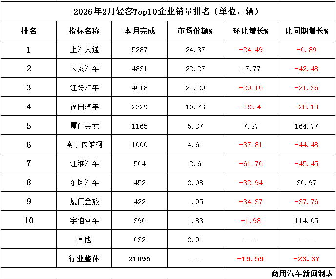 中国汽车工业协会数据显示,2026年2月,轻客市场(含非完整车辆)共销售21696辆,环比下降19.59%,同比下降23.37%,依旧是同环比双降,没能逆转开年以来的下行趋势。