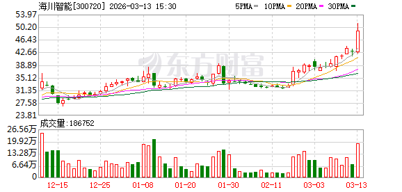 证券时报·数据宝统计显示,海川智能今日收盘价为49.18元,上涨14.69%,日换手率为10.69%,成交额为8.89亿元,全天主力资金净流入494.60万元,近5日该股累计上涨25.11%,近5日资金合计净流入8129.61万元。