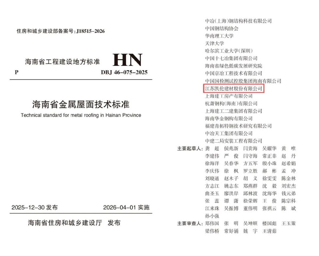慧正资讯,近日,海南省住房和城乡建设厅正式发布《海南省金属屋面技术标准》,这一针对海南“高温、高湿、高盐、高辐射、多雨、多台风”极端气候的地方标准,将于2026年4月1日起实施。作为标准的重要参编单位,江苏凯伦建材股份有限公司将其核心产品技术与丰富的工程实践经验注入标准条文,为海南乃至整个热带沿海地区的建筑安全,提供了坚实的技术支撑与“凯伦方案”。